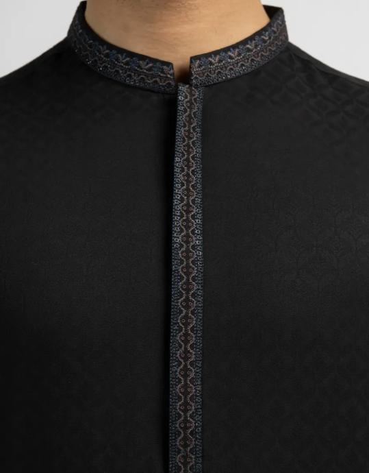 A stylish black men special kurta made from blended fabric for smooth and comfortable wear. Designed with a polished traditional cut that delivers a sophisticated appearance.