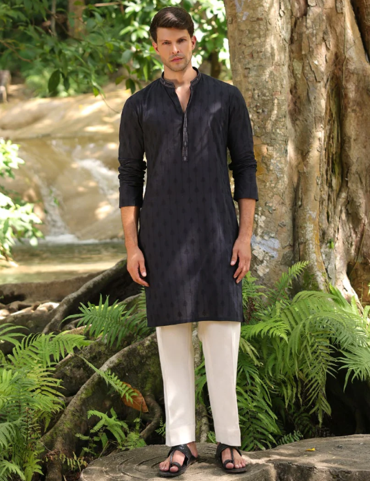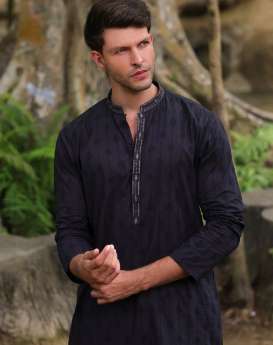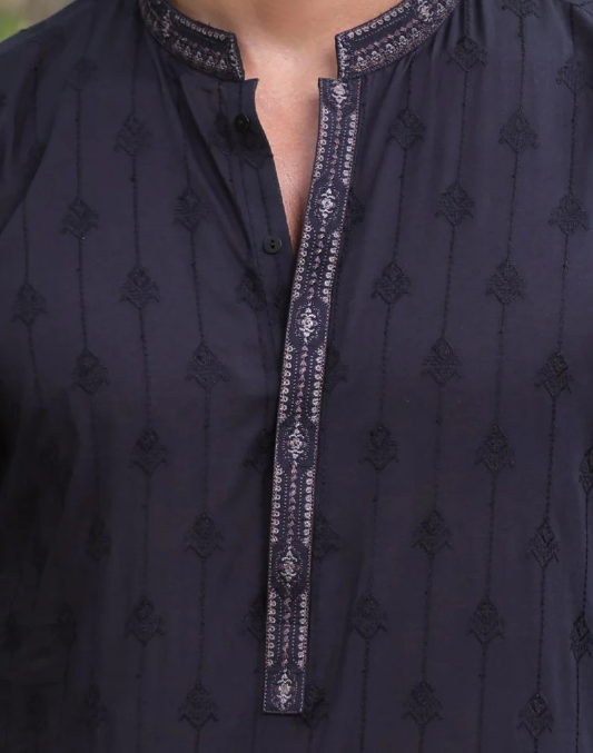 This black schiffli cotton formal kurta blends traditional style with a modern look. Made with care and clean design, it’s a great choice for weddings, events, or festive wear.