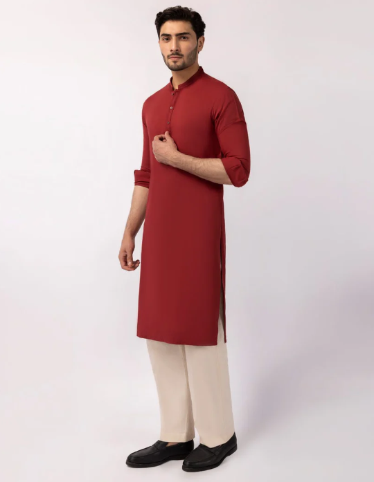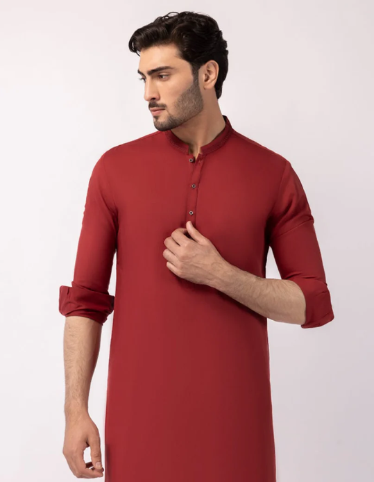 A semi-formal kurta stylized with embroidery on the collar and front placket. The elegant embroidery highlights the design, creating a sophisticated look for formal occasions.