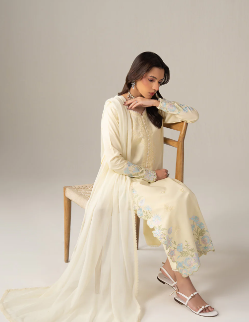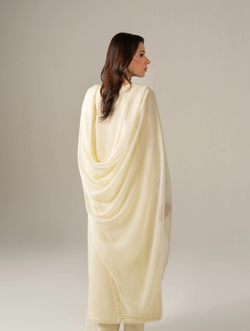Elevate your wardrobe with this charming 3-piece pret set in a delicate Sweet Com shade. The lawn shirt features a round neck with lace detailing, styled in a long silhouette with scalloped embroidered hem and side slits for a graceful flow. Fitted sleeves with embroidered hems and lace accents add a refined touch, perfectly paired with straight-fit cambric cotton pants. The look is completed with a georgette chiffon dupatta featuring lace detailing on all four sides, creating an effortlessly elegant ensemble.