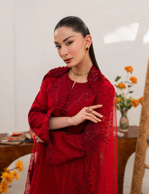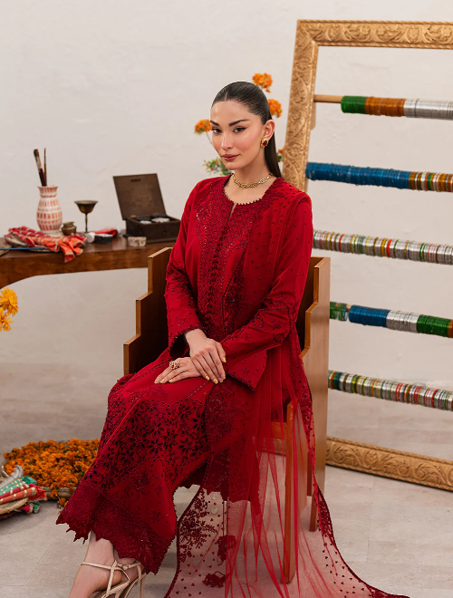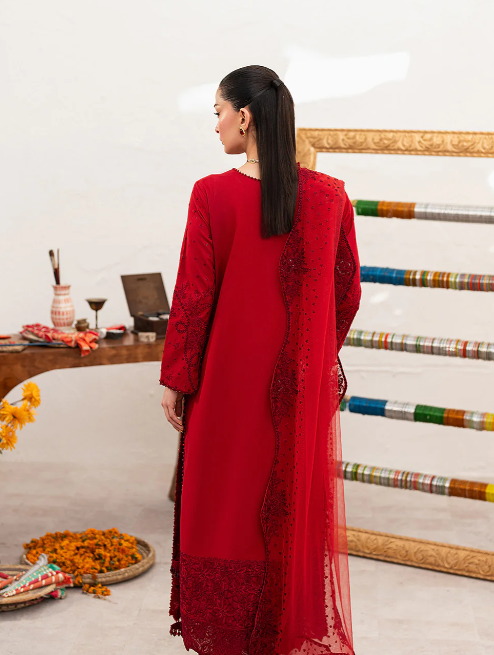 Elevate your style with this elegant 3-Piece Red Lawn Suit, designed for a graceful everyday look. The lawn shirt features a beautifully embroidered neckline, round neck with slit and loop button detailing, finished with delicate lace and pearls. Paired with a cambric cotton straight trouser with embroidered border and Bareeze net dupatta, while fitted embroidered sleeves and side tassels add a charming finishing touch. Perfect for a chic and sophisticated outfit.