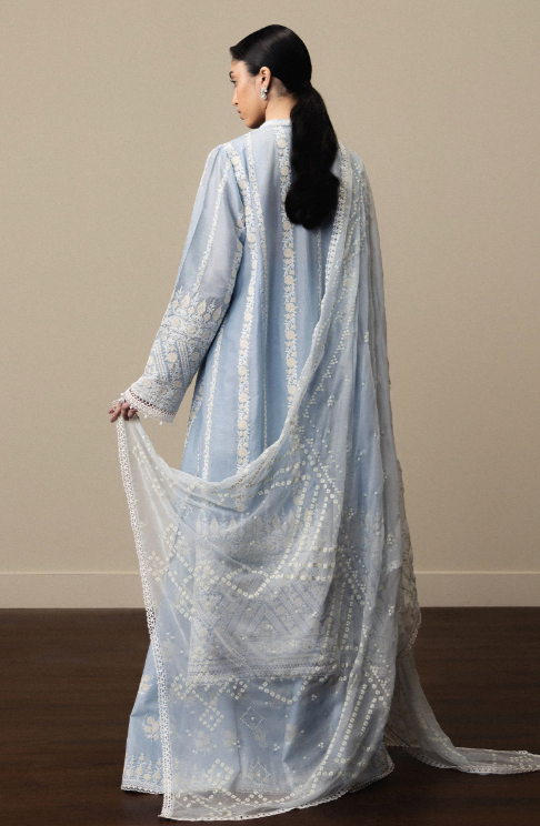 Aoyomi is crafted in serene sky blue Pima lawn, detailed with delicate folk-inspired aari tanka embroidery arranged across structured panels. The look is completed with a softly paste-printed chiffon dupatta and embroidered cambric trousers, expressing quiet refinement and thoughtful design.