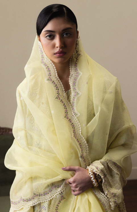 Hinata is crafted in luminous sunlight yellow, detailed with delicate chikankari embroidery across the shirt and dupatta for a graceful, radiant silhouette. Complemented with matching embroidered cambric trousers and layered organza borders, the ensemble embodies timeless sophistication and heritage-rooted charm.