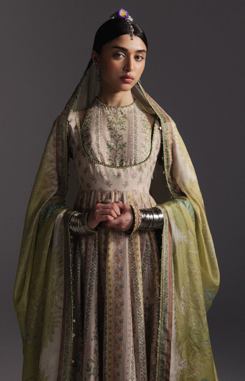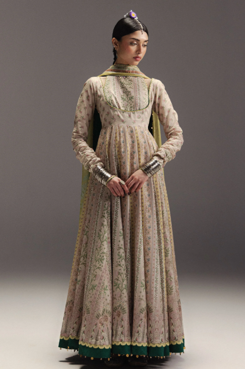 Hoorain is a classic and artisanal Anarkali crafted on an ivory base, featuring vertical panels adorned with delicate floral vines and clusters in warm shades of red and sage green. The silhouette is elegantly grounded by a multi-tiered hemline embellished with traditional paisley (buta) motifs and intricate linear scrolls, adding timeless sophistication. A bold crimson silk dupatta completes the ensemble, enriched with a large-scale ornate scrollwork frame, corner paisley accents, and contrasting green piping that unites the palette. Hoorain embodies ethereal elegance, artisanal craftsmanship, and graceful refinement, making it a statement piece for heritage-inspired contemporary wardrobes.