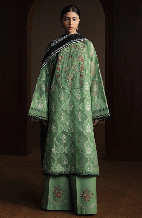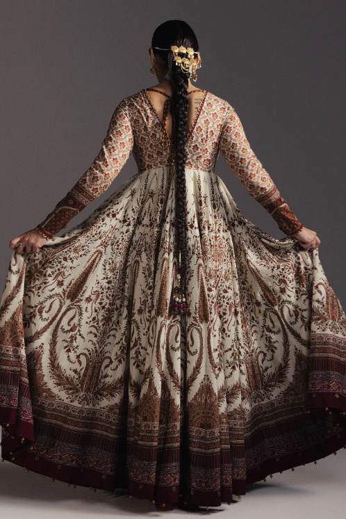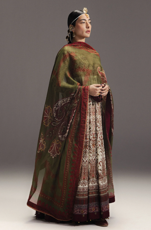 Shahkar is a classic Kalidaar Anarkali crafted in high-grade Pima lawn, offering a breathable yet silky finish that enhances its graceful movement. Set against a timeless ivory base, the design is adorned with deep maroon artisanal prints inspired by traditional Kashmiri shawl motifs, featuring intricate floral vines and refined vertical patterns that elongate the fourteen-panel silhouette. The composition reflects heritage artistry while maintaining a structured elegance. Paired with a digitally printed cambric trouser and elevated with a vibrant green silk dupatta, Shahkar creates a rich, high-contrast statement that embodies regal sophistication and enduring craftsmanship.