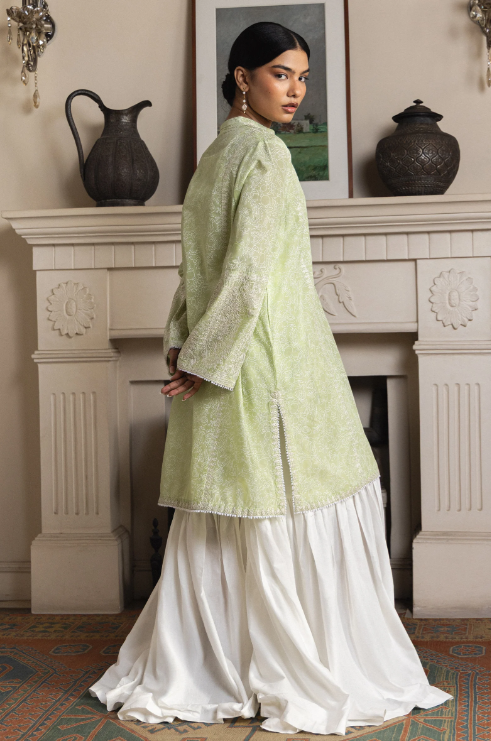 Sabaa is a fresh green kurta designed with a modern, relaxed sensibility. Cut in a short, boxy silhouette, it offers effortless wearability while maintaining a contemporary edge. The surface is adorned with delicate off-white screen printing, creating a soft visual rhythm across the fabric. Intricate aari work on the neckline and sleeve hems adds a layer of refined craftsmanship, elevating the simplicity of the piece. Sabaa is an easy yet polished choice for everyday elegance.